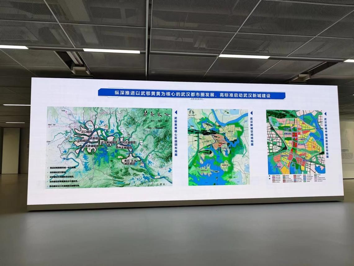 本次研学的第一站是武汉新城展示中心。武汉新城展示中心选址光谷科创大走廊鄂州段起点,向东望去,千亿产业大道未来三路宽阔通畅,独树一帜的光电子信息产业在此蓬勃发展。在新城展示中心,同学们通过丰富的文字和视频资料学习了《湖北省流域综合治理和统筹发展规划纲要》的落实办法和未来目标,感受到了“区域协同绘蓝图”的强大生命力。