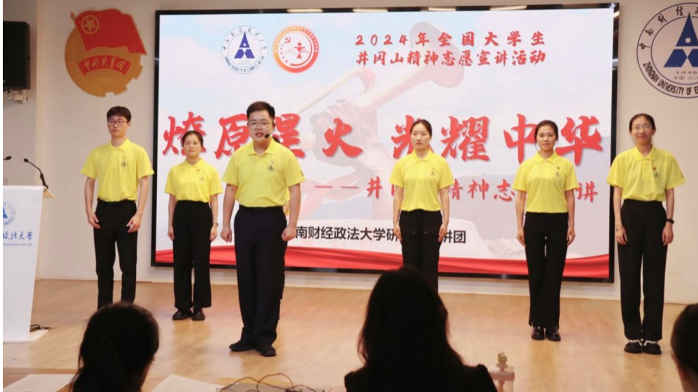 学习交流会后,校研究生宣讲团成员做题为《燎原星火 光耀中华》的井冈山精神联合示范宣讲。硕士研究生肖勇、邱婷兴、王先林、万雯、宋浩田、瞿菲、朱建桦通过五个精心设计的联动篇章——“坚定执着追理想”“实事求是闯新路”“艰苦奋斗攻难关”“依靠群众求胜利”以及“新时代的井冈山”,全面而深入地展示了井冈山精神的丰富内涵和时代价值。宣讲过程中,成员们巧妙结合“一份誓词 代代坚守”“朱德的扁担”“今昔神山村”等生动案例,融入诗词朗诵《西江月·井冈山》和歌曲《三大纪律八项注意》等艺术形式,使得整个宣讲既富有历史厚重感,又充满了时代气息,赢得了在场师生的热烈掌声和高度评价。