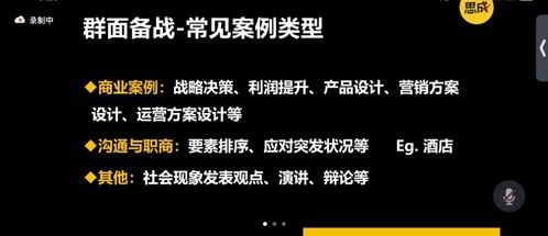 最后,王老师还结合此次面试材料类型分享了其他群面备战的常见案例类型,具体包括商业案例、沟通与职商,以及其他类型。这些内容为同学们提供了宝贵的实战经验。
