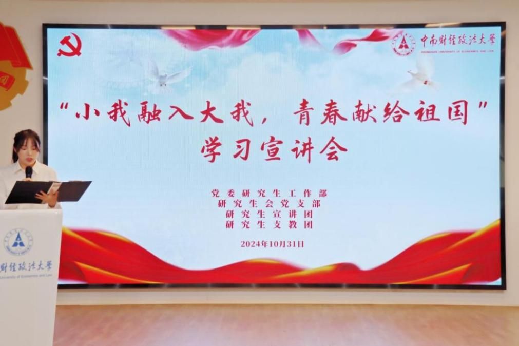 (通讯员 王馨婷 何海燕 黄千芷 摄影 童麟舒 付涵)为深入学习党的二十届三中全会精神、全国教育大会精神,从党的精神谱系中汲取青春力量,厚植爱国情怀,砥砺强国之志,2024年10月31日14时,学校党委研究生工作部于大学生素质教育中心路演厅举办时代新人培育微课堂-“小我融入大我,青春献给祖国”学习宣讲活动。党委研究生工作部研究生思想政治教育办公室付慧娟老师出席会议。校研究生会党支部成员代表、校研究生宣讲团成员代表、校研究生支教团成员代表以及学校2024年度研究生样板党支部培育项目负责人代表参加会议。本次宣讲会由工商管理学院谢依婷同学主持。