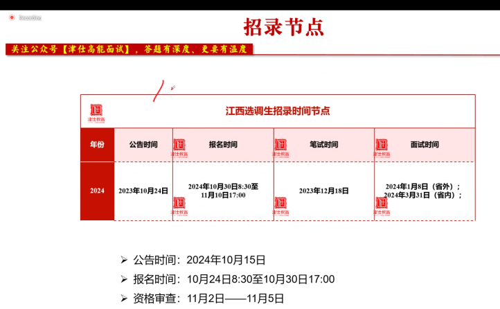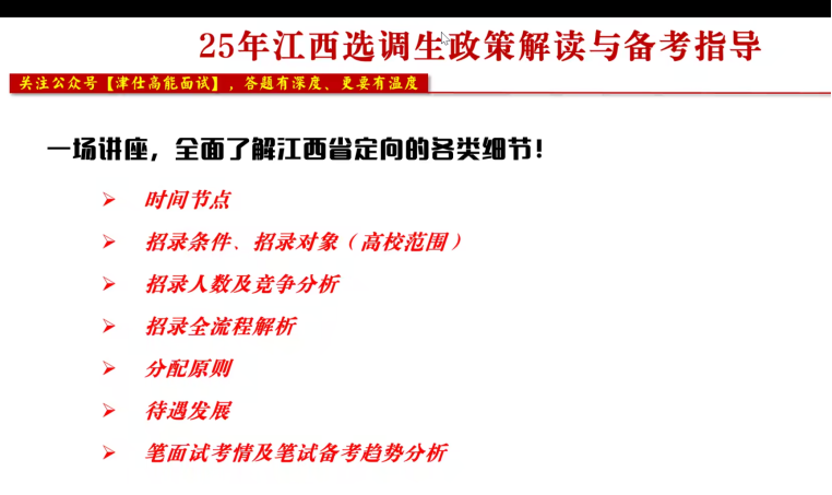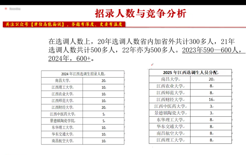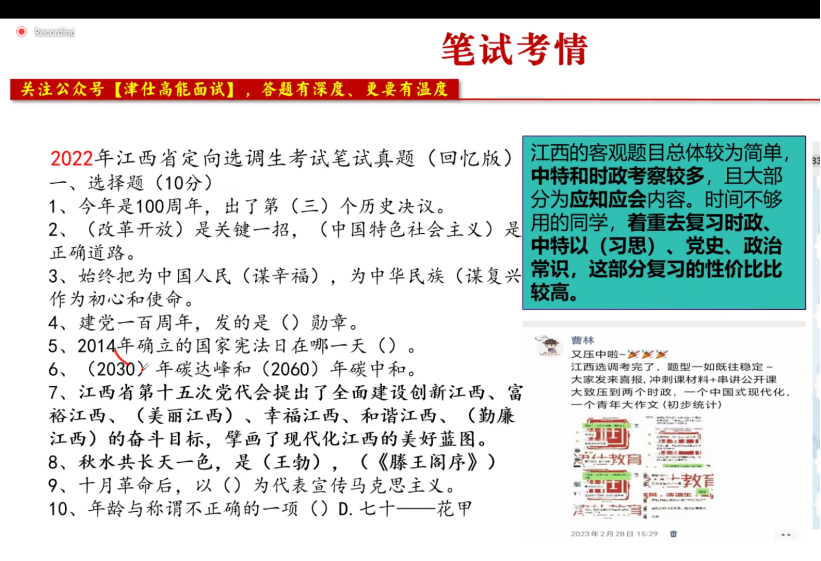 在备考规划环节,曹老师围绕江西选调笔面试的命题趋势进行了深入讲解,另外还补充了往年具体题型等信息。不仅如此,老师为同学们比较了江西选调考试与他省选调考试中存在的面试流程与考察题型等异同,就江西选调笔试的考察倾向提供了更高效科学的备考建议。