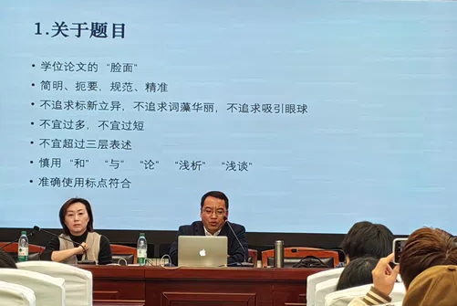 会议伊始,庞金友教授首先强调了学位论文的重要性,指出学位论文将会伴随大家一生,必须端正态度,积极重视。而后他从写作形式、对象、评价标准、写作目的、应用场合、呈现重点、篇幅大小等诸多角度,讲解学位论文和学术论文的区别。庞教授以严谨细致的态度,深入讲解了学位论文撰写的基本要求。他强调,一篇优秀的学位论文应具备坚实的理论框架、扎实的专业基础、完整规范的结构以及一定的理论创新性。庞教授特别指出,论文选题是学术研究的起点,必须充分听取导师的意见,虚心求教,脚踏实地,尽可能选择与核心学术话题相关的题目。关于论文撰写过程,庞教授提出了一系列实用的准则与技巧,以及其他需要注意的问题。