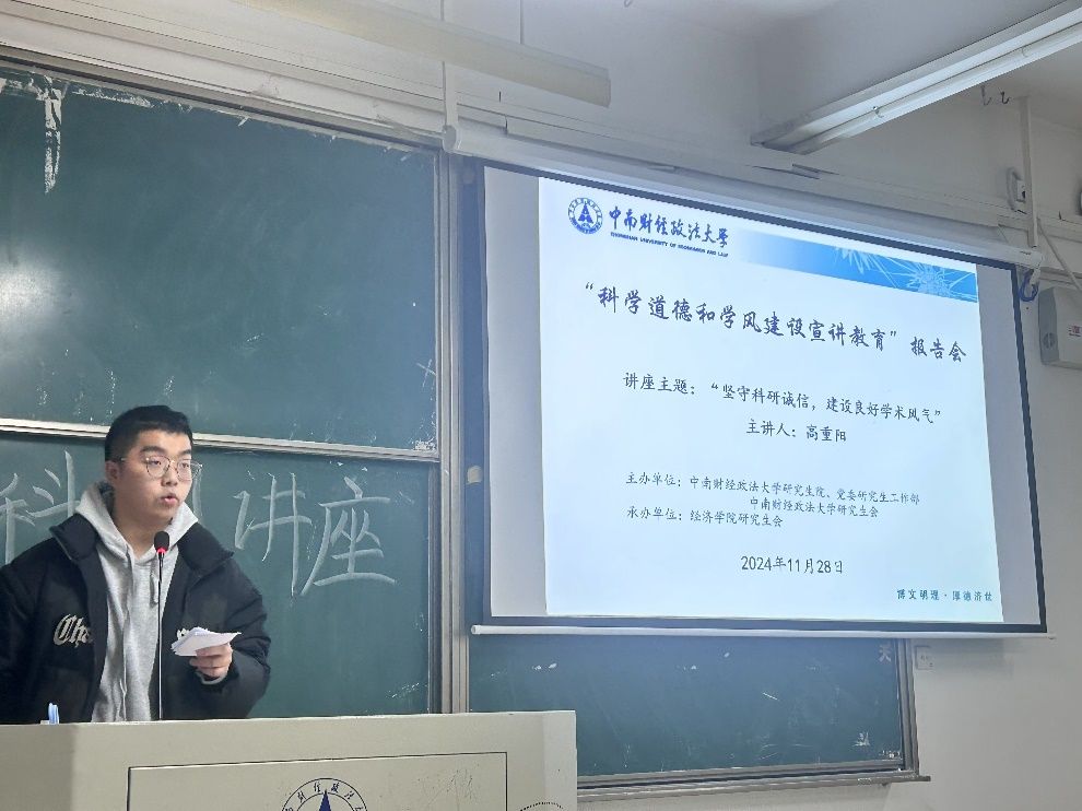 (通讯员:雷菁 张芷若)为深入学习贯彻习近平新时代中国特色社会主义思想和党的二十大精神,全面落实习近平总书记关于科技创新、学风建设的重要论述和指示精神,传承弘扬科学家精神,营造良好学术风气,在我校深入推进科研诚信和学术风气建设。由米兰电竞·(中国区)研究生院、党委研究生工作部和校研究生会主办,经济学院承办的“科学道德和学风建设宜讲教育”活动于2024年11月28日19:00在文添楼209成功举办。本次活动特邀经济学院2022级世界经济专业博士研究生高重阳主讲,以其深厚的学术底蕴和丰富的科研经验,为同生们带来了一场关于科研诚信的宣讲分享。