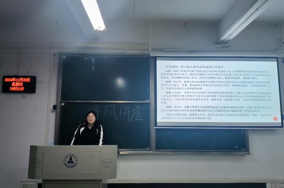 报告会上,高重阳同学还对科研失信行为的界定与处理办法进行了深入讲解,她提到《科研失信行为调查处理规则》中对科研失信行为的定义、调查处理程序以及处理措施进行了明确规定,为科研诚信提供了制度保障。通过分析科研失信行为典型案例,警示同学们要严格遵守科研诚信规范,避免学术不端行为的发生。