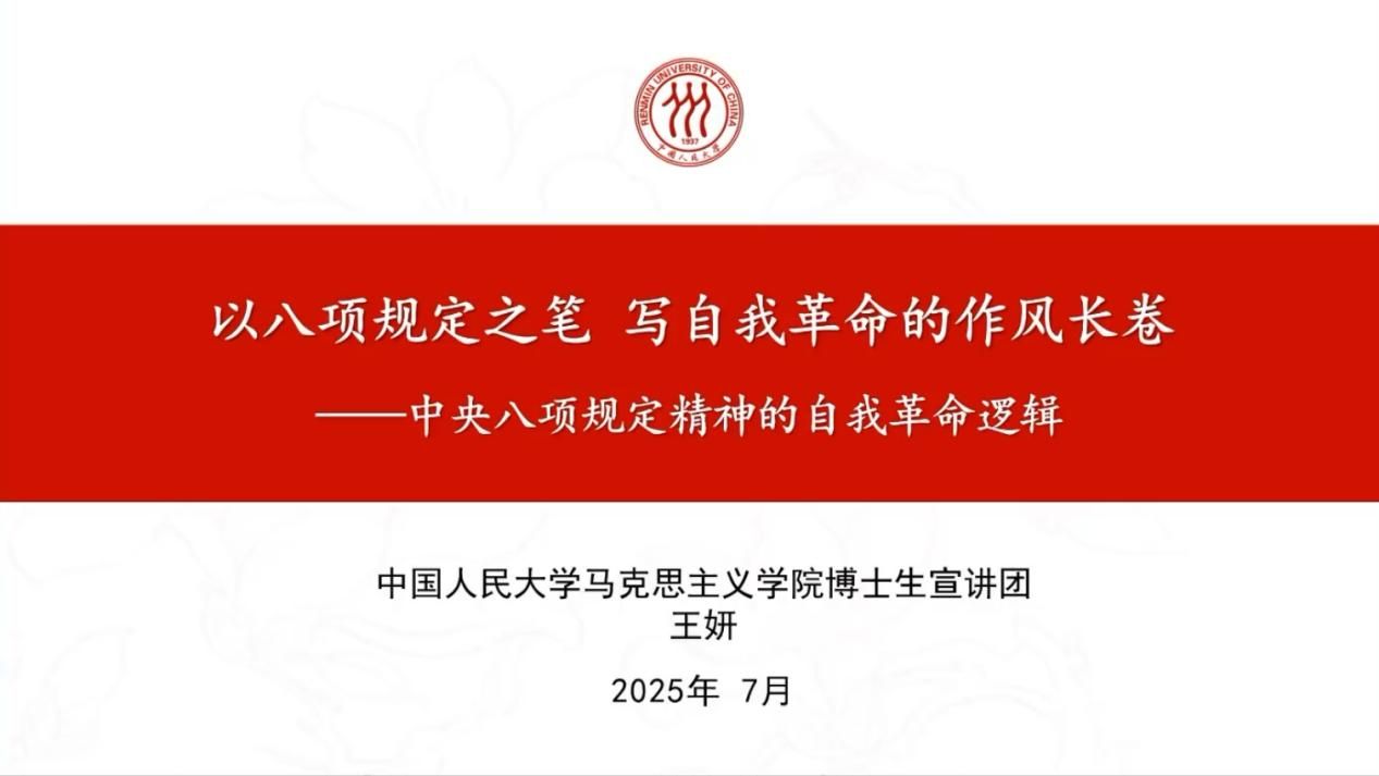 中国人民大学马克思主义学院博士生宣讲团刘志铭以《作风建设永远在路上》为题率先开讲,深刻阐述了作风建设的历史必然性、长期性和艰巨性,强调其作为永恒课题的重要意义。中国人民大学马克思主义学院博士生宣讲团王妍带来题为《以八项规定之笔,写自我革命的作风长卷——中央八项规定精神的自我革命逻辑》的宣讲,聚焦中央八项规定精神,精辟剖析了其蕴含的深刻自我革命逻辑。