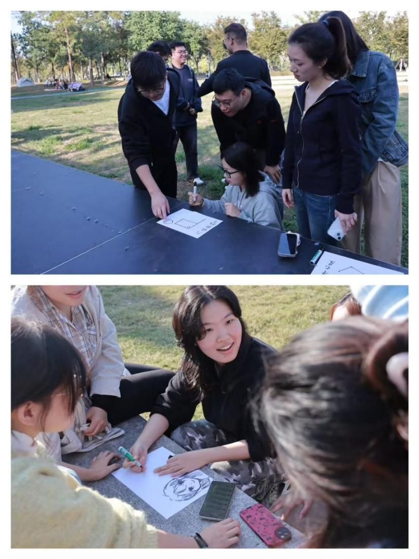 活动过半,经过两个游戏环节的磨合,同学们的团队配合愈发默契。在主持人的引导下,大家开始构思队名和口号,绘制队旗和队徽,进行团队建设。同学们热烈讨论后在白纸上呈现出颇具创意的设计,并依次将各自的创意声情并茂地介绍给大家。在这个环节中,各小组成员间的默契和团队凝聚力进一步增强。