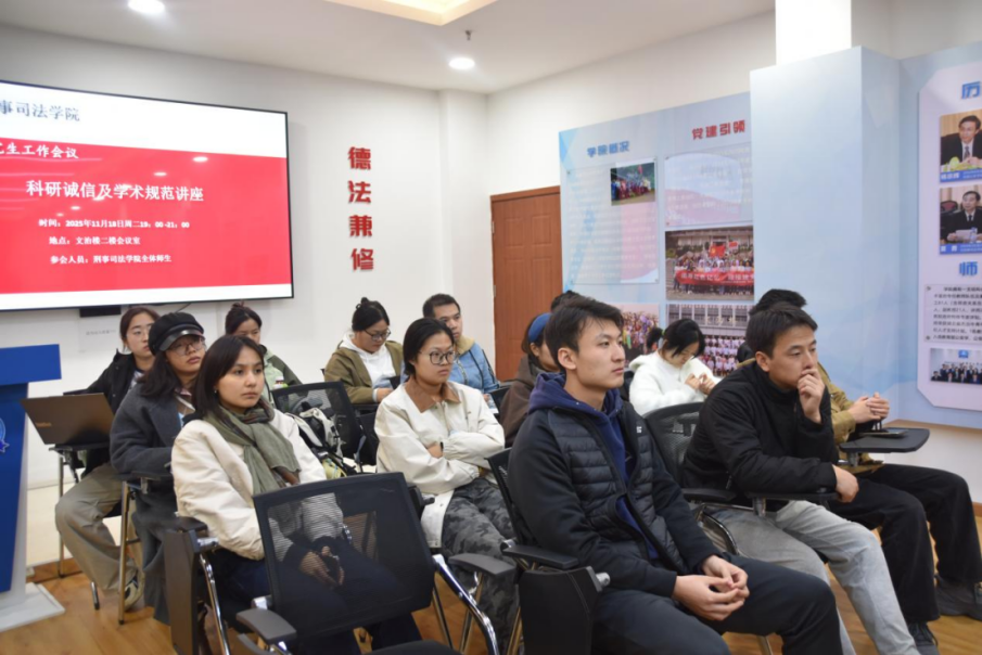 新闻网讯(通讯员王晓丹 摄影李梦洁)2025年11月18日,刑事司法学院于文治楼二楼会议室召开研究生学风建设与科研诚信规范讲座。学院副院长焦俊峰教授主讲,学院全体研究生参加。本次讲座聚焦学风建设、论文写作与科研诚信,旨在进一步强化研究生学术规范意识与科研诚信素养,提升我院研究生培养质量。