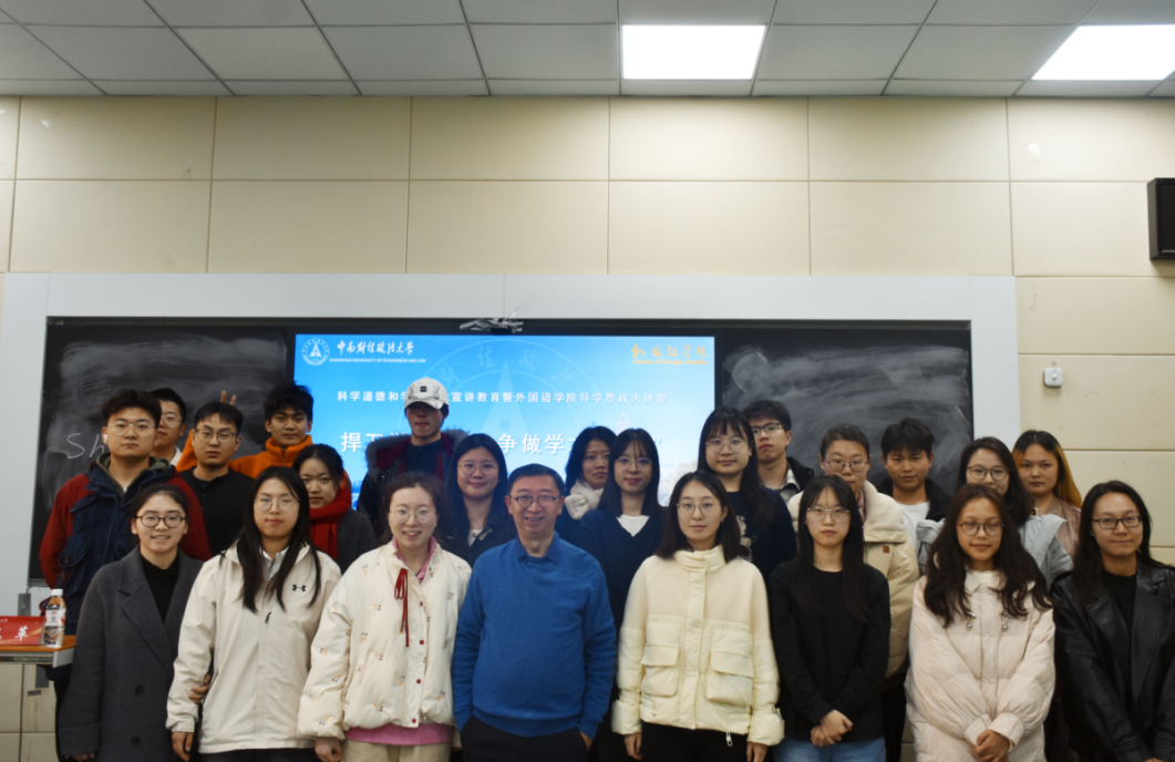 (通讯员 张冉 彭沁鑫 范雨欣)2025123下午,为强化研究生学术诚信意识,筑牢学术道德底线,科学道德和学风建设宣讲教育活动暨导学思政大讲堂在文波楼109智慧教室举行。本次讲座以“捍卫学术伦理,争做学术‘真人’”为主题,邀请外国语学院王革教授担任主讲人,2024级、2025级研究生代表到场聆听,现场座无虚席。讲座由研究生工作办公室主任张冉主持。