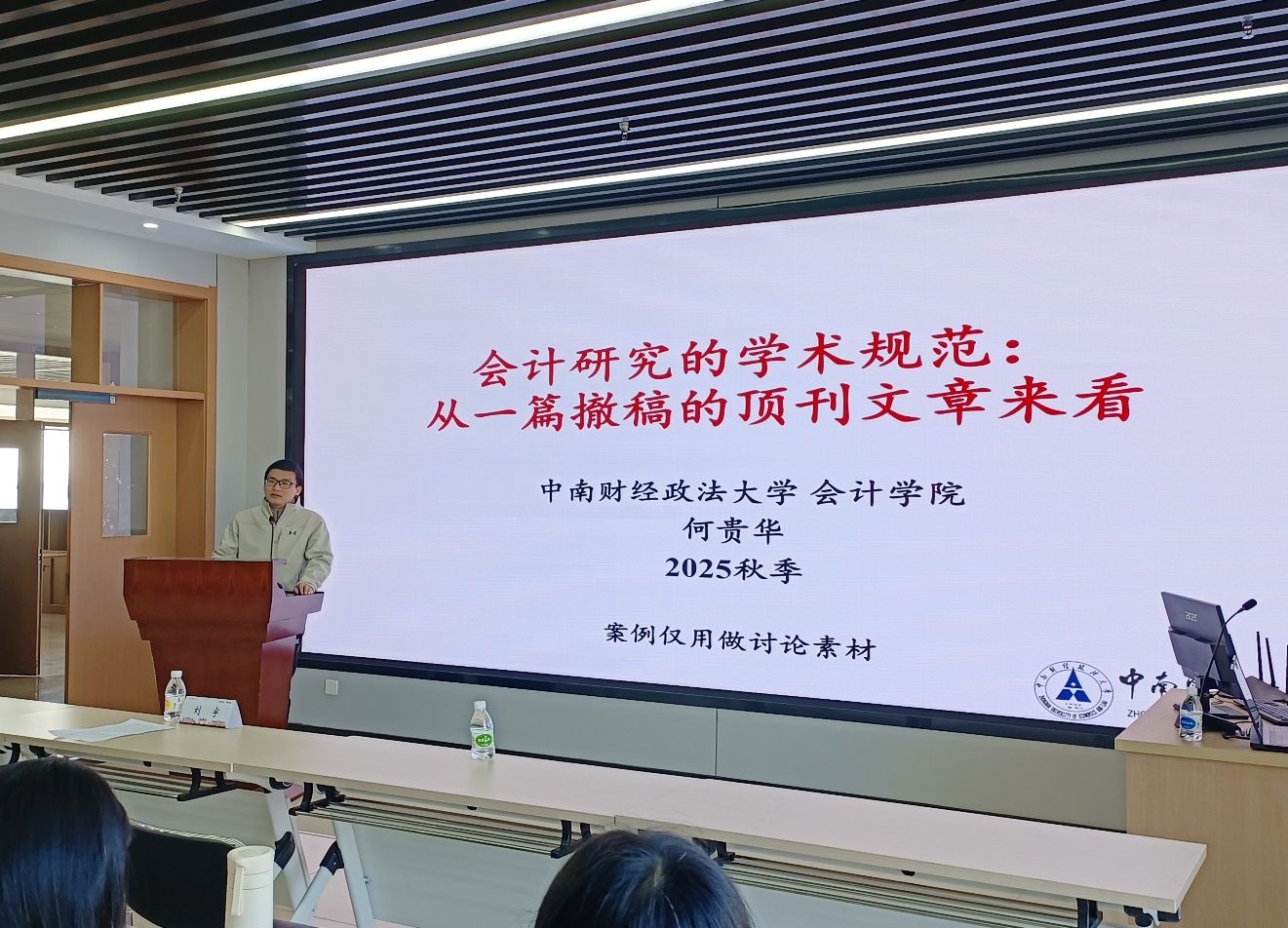 活动中,学术学位硕士研究生导师组组长何贵华副教授开展《科研诚信与学术规范》专题讲座。何贵华老师结合“顶级期刊撤稿”的案例,剖析了学术研究真实性保障路径,他指出,表面上的技术操作失误实际上暴露出来的是比抄袭剽窃更为隐蔽、却也同等严重的学术诚信问题——数据的可追溯性与研究的透明度危机,科研不端的后果极其严重,发人深省。同时,他与同学们分享了会计研究中的学术规范点,帮助同学们系统掌握方法与写作披露规范、数据管理规范和引用规范。何贵华老师强调会计职业操守与职业能力同等重要,并引用四句箴言“诚信为本、操守为重,坚持准则,不做假账”,与大家共勉,希望同学们在未来的职业生涯中坚守学术诚信!