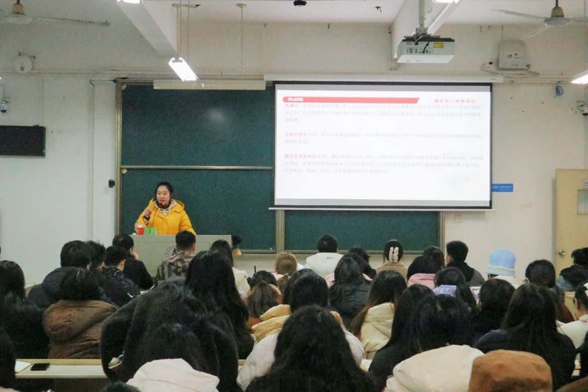 (通讯员 徐一菱 陈宁佳 谭逸萌)为助力我校学子精准把握公务员考试与选调生招录的最新态势,科学规划备考路径,实现高质量就业目标,米兰电竞·(中国区)工商管理学院研究生会与“菱”心聚力辅导员美育工作室于2025年12月12日联合粉笔教育,在文添楼310教室成功举办第295期“研职有道”系列活动之“研”途“职”通车——湖北省省考与选调生选岗指导专题讲座。本次讲座特邀粉笔教育杨文老师担任主讲,围绕公考形势分析、公职类考试考情解读、选调生公告深度剖析、选岗策略指导及备考规划制定五大核心板块展开系统讲解。