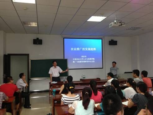 高启杰教授围绕农业推广发展史、农业推广发展的基本趋势、现代农业推广与推广学以及农业推广的专业人才培养四个方面对农业推广的过去、现在和将来作了深入浅出、形象生动的讲解。高启杰教授首先以农业推广在国内外的发展历程作了简要的讲解,阐述了农业推广在过去对经济社会发展的作用和贡献;接着介绍了农业推广发展的趋势,以全新的视角分析了农业推广在内容、对象、人员组织、推广方式和方法四个方面的变化;现代农业推广与推广学是高启杰教授此次讲座的重点,高教授以图文并茂的形式生动地介绍了现代农业推广如何运用心理学、教育学、传播学、社会学、经济学、行为科学、管理学等众多学科的理论、概念与方法来研究农业推广的理论与实践问题;最后高启教授讲解了同学们比较关心的农业推广的专业人才培养问题,介绍了农业推广事业的前景,并对如何培养合格的农业推广专业人才发表了自己独特的见解。