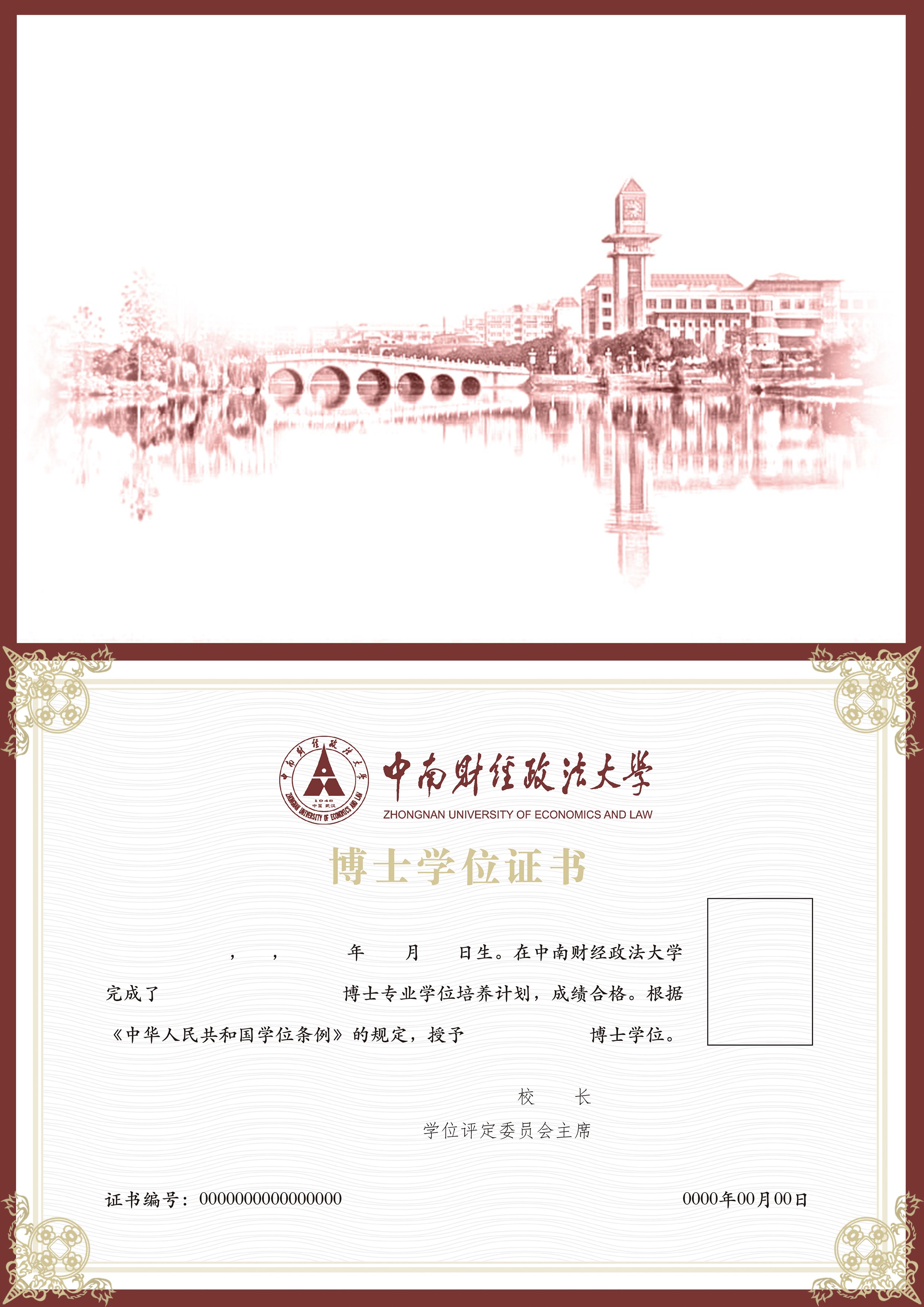 封套正面设置校徽和学位证书字样组合,背面设置魏碑体校训,简约庄重。证书由含有学位授予信息的内芯和校园标志风景的副内芯组成,校名校徽采用学校标准视觉识别系统(VI)图案组合。因学校地理特点和校内建筑命名均与水渊源颇深,故内芯以水波做防伪纹底,取“上善若水、波澜不惊”之寓意。镶置角标以“古币”象征财经,以“獬豸”寓示政法,獬豸围绕古币在外,两者相得益彰。边框设计使用香槟金色文武线,成方正直角,与水波纹的弧形相辉映。
