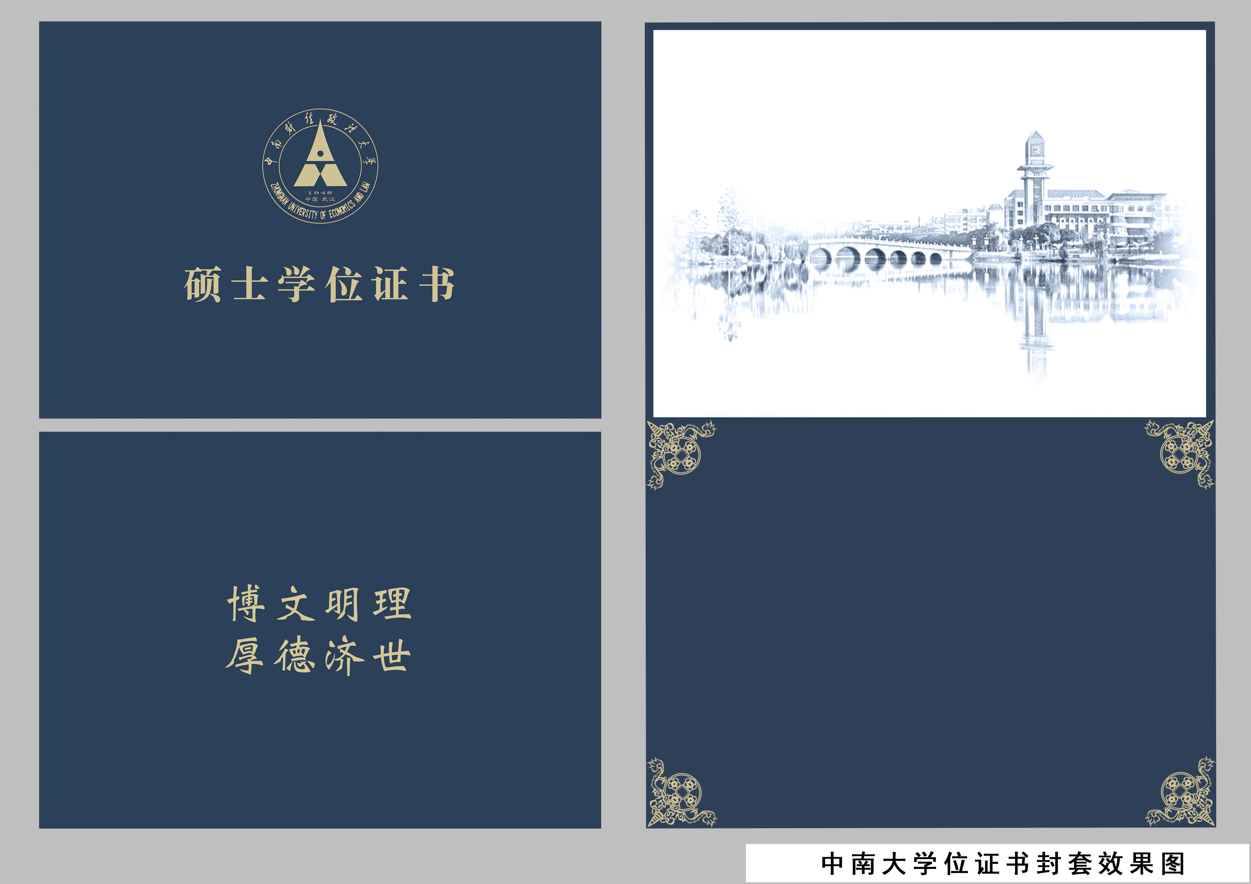 新版学位证书包括封套和证书(内芯)两部分,整体设计融合了中南大的校园文化和精神内涵,充分体现了中南大历史文脉、地理特点、文化背景和专业特色,简约与典雅兼收,个性与庄重并蓄,突显校园文化底蕴。新版证书依然采用横版设计,以主体颜色基调和尺寸大小来区分不同类别学位,其中学士、硕士、博士分别以青城绿、寒波蓝、幽橘红等颜色区分,证书尺寸按国际惯例从学士到博士依次增大。