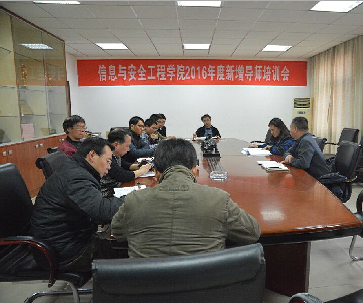 2016年12月8日下午16:00,信息与安全工程学院在文永楼203会议室举行了2016年度新增导师培训会,学院院长张敬东教授、党委书记张从发、各导师组组长以及2016年度新增硕士生导师参加了此次培训会。