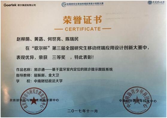 在屈振新、金大卫老师指导下,赵柳荫、黄菡、何世亮和陈瑞民同学设计了作品“易诊通--基于蓝牙室内定位的就诊提示跟踪系统“,和全国531个作品角逐,其中不乏清华大学、浙江大学、武汉大学、北京航空航天大学、厦门大学、大连理工大学等双一流院校的作品,以排名前85的成绩杀入决赛。