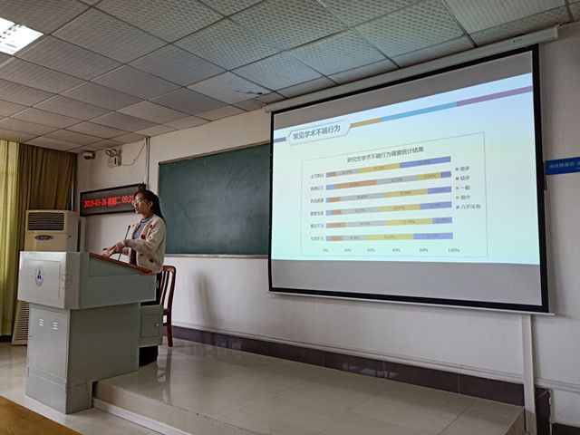 宣讲现场,赵老师从科研诚信和学术规范、信息化手段助力学术不端检测、学术研究和科研创新三个方面为参会同学展开细致讲解。首先,她通过案例帮助同学们更全面、深入地了解到学术不端的危害,并强调发表论文的数量不能完全代表科研的能力。在宣讲过程中赵老师还通过展示不达标论文的检测结果来介绍“知网”产生高复制比以及可能造成学术不端检测无法通过的原因,以此帮助同学们在论文撰写过程避免文献的不当引用。之后,赵老师针对如何进行学术研究和科研创新从导师培养模式、文献筛选方法以及大数据运用等方面向同学们提出建议。