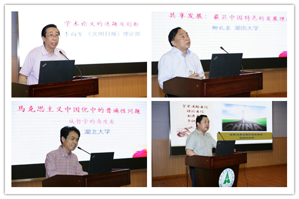 《光明日报》理论部原主任李向军就“学术论文的选题及创新”为题,给大家做了精彩的报告,在学术论文应如何切题,如何创新等方面,给了与会老师同学新的启示。湖南大学马克思主义学院柳礼泉教授报告的题目为“共享发展:最具中国特色的发展理念”,紧跟现实问题,深入剖析了共享发展理念的时代价值。湖北大学哲学院院长戴茂堂教授做了以“马克思主义中国化中的普遍性问题——从哲学的角度看”为题的报告,从哲学角度阐述了全球化大背景下,中国问题同世界问题的紧密联系。华中师范大学政治与国际关系学院王建国教授带来“中国特色社会主义道路何以自信”的主题报告,点明中国特色社会主义道路的自信之源,区别了自信和盲目的区别,指明了维护道路自信我们应该如何做。