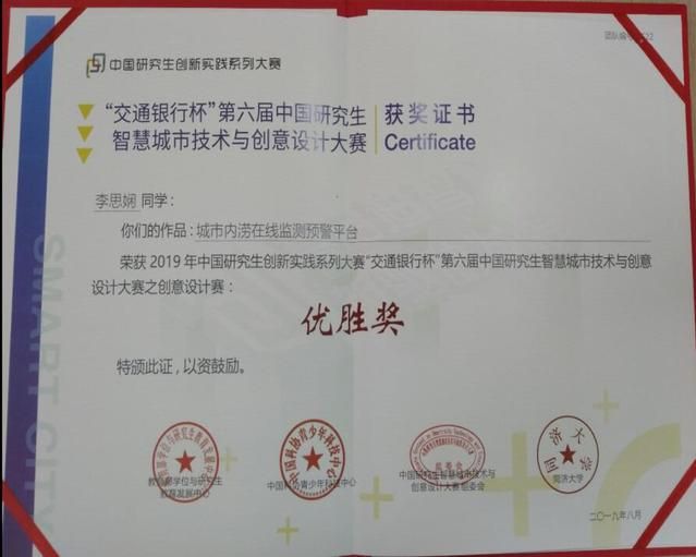 (通讯员:付慧娟)2019年8月9日至11日,信息与安全工程学院管理科学与工程(安全管理)专业研究生胡美娟、李思娴、刘冉同学赴同济大学,参加 “交通银行杯”第六届中国研究生智慧城市技术与创意设计大赛决赛并取得全国优胜奖的好成绩。