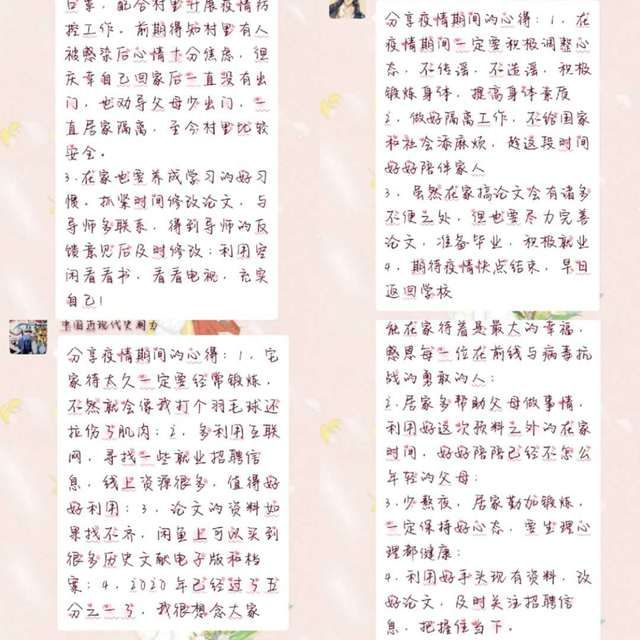 三个年级团支部分别组建一支“防疫联络队伍”,实行以寝室为单位各设一名负责人协助班级团支部开展健康状况摸排工作,每日对班级成员身体状况,宅家隔离情况等健康数据进行摸排,坚持“日报告”“零报告”制度,做到“守土有责、守土尽责”,关注班级同学宅家动态,将疫情防控工作落实到每位班级同学身上。同时,三个年级团支部也依据年级特点分别展开了线上的交流与分享,2017级团支部线上分享了学习生活经验,主要围绕于防疫期间毕业季的论文写作和工作求职等方面进行交流,即使宅在家中也时刻心系学业与工作;2018级团支部在线的“云”关心、“云”温暖,则有效帮助班级同学减缓疫情期间的焦虑与恐慌,在完成课业之余,积极动员班级同学开展丰富的“美食比拼”活动,一团面粉制作出形色各异的糕点,一道道菜肴秀色可餐,丰富疫情期间的日常生活,增强班级同学的动手能力;2019级团支部则主要围绕线上课程学习进行交流探讨,宅家也要重视完成课业的质量与效率,线上的专业交流与探讨,学习资源的及时发布,都为班级同学的学习提供了保障,不让疫情影响学业的进度。