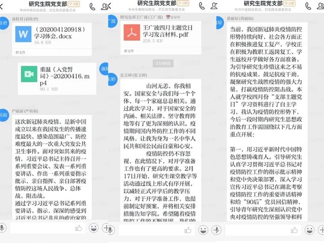 研究生院党支部通过QQ群、微信群和学习强国“学习群”三大平台,向支部成员分享《习近平主持召开中央全面深化改革委员会第十二次会议强调 完善重大疫情防控体制机制 健全国家公共卫生应 急管理体系 把生物安全纳入国家安全体系》《习近平新时代中国特色社会主义思想三十讲:第二十三讲》《新时代爱国主义教育实施纲要》《习近平:在湖北省考察新冠肺炎疫情防控工作时的讲话》《习近平给北京大学援鄂医疗队全体“90 后”党员的回信》《习近平主持召开中共中央政治局常务委员会会议 分析国内外新冠肺炎疫情防控和经济形势 研究部署统筹抓好疫情防控和经济社会发展重点工作》《习近平在浙江考察时强调 统筹推进疫情防控和经济社会发展工作 奋力实现今年经济社会发展目标任务》等学习材料,为支部全体党员同志顺利完成线下自学提供了充足的保障。