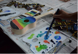 当轻巧灵动的尤克里里遇上彩绘创意时光,音乐与色彩的碰撞正式开始。老师们根据自己挑选的绘画图案在琴面上用颜料绘制,使得原木色的琴身在色彩的点缀下,更加惹人喜爱。绘制完琴面,便是安装琴头和琴弦的步骤,老师们互相帮助、交流经验,制作过程中遇到问题及时与指导老师进行沟通,活动气氛紧凑又欢乐。可爱的琴身配以独一无二的彩绘,每一把尤克里里都是独一无二的存在,每个人都获得了一份满满的成就感。