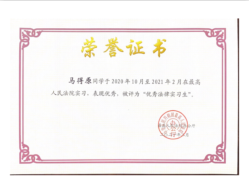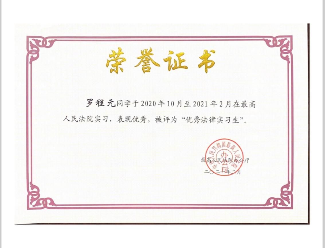 最高人民法院法律实习生制度是贯彻落实习近平总书记关于青年工作和法治人才培养重要论述的具体举措。罗程元、马得原作为我校推荐的最高人民法院第九批法律实习生,在2020年10月-2021年2月四个月的时间里,在实习导师的指导下,参与了辅助审判、司法调研和综合行政等工作,并获评“优秀法律实习生”荣誉称号,从实践层面展现了我校与最高人民法院的密切合作与交流,充分体现了我校研究生过硬的思想政治素质、较强的司法实践能力与社会适应能力。