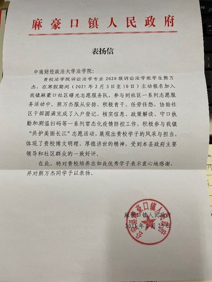 在志愿活动中,熊万杰服从安排,细心负责,踏实肯干,用实际行动践行了我校“博文明理,厚德济世”的校训,彰显出法学院“博学、韬奋、诚信、图治”的学院精神,更展现了当代青年大学生的风采与担当,受到了当地县政府领导和社区群众的一致好评。当地镇政府对熊万杰同学予以表扬。