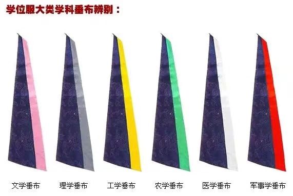 垂布为套头三角兜型,饰边处按文、理、工、农、医、军事六大类分别标为粉、灰、黄、绿、白、红颜色。