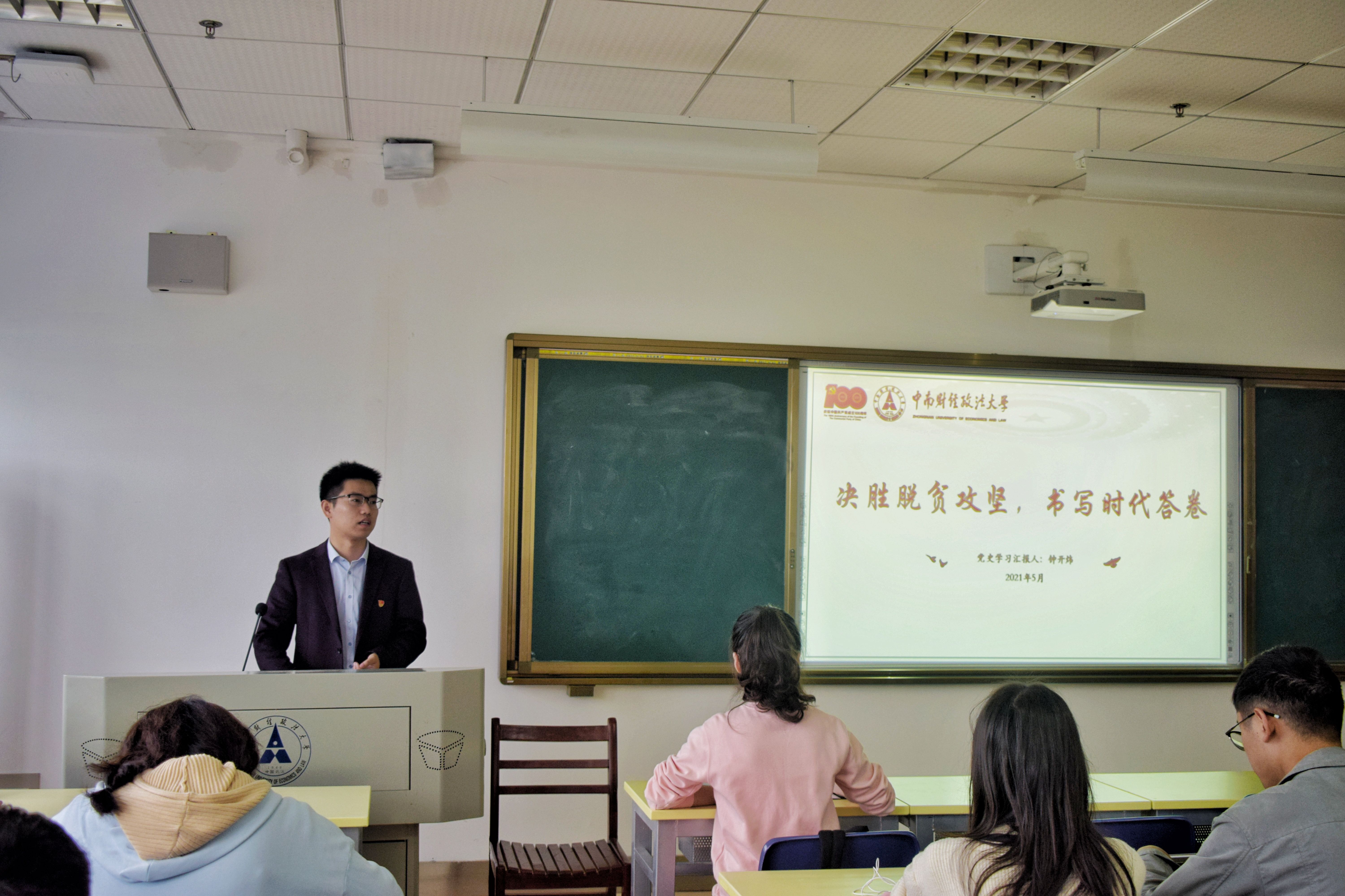 钟开炜以“决战脱贫攻坚,书写时代答卷”为主题,结合自身的支教与志愿服务经历,讲述了“改革先锋”吴金印、“时代楷模”黄文秀的先进事迹以及反哺家乡的云岭(梁河)大学生返乡志愿服务队项目事例。本次学习讲述了党员同志们在脱贫攻坚征程中的感人事迹,向研究生代表们展现了“上下同心、尽锐出战、精准务实、开拓创新、攻坚克难、不负人民”的脱贫攻坚精神。钟开炜表示,解决绝对贫困不是终点,而是新生活、新奋斗的起点。面对乡村振兴的重任,当代青年仍要不懈奋斗,才能保证脱贫基础更加稳固、成效更加持续。钟开炜号召广大青年要肩负历史使命,坚定前进信心,努力成为堪当民族复兴重任的时代新人,让青春在为祖国、为民族、为人民、为人类的不懈奋斗中绽放绚丽之花。