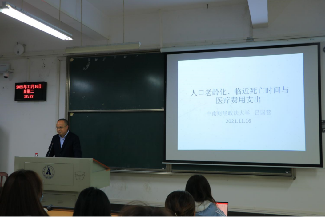 “随着人口老龄化的增长,老年医疗费用支出一定会增加吗?”吕国营教授首先提出这一问题引起在座同学思考,进而给出答案:临近死亡时间才是老年人医疗费用增长的重要原因,并由此话题引出第一部分,即老年医疗费用的年龄分布。吕国营教授指出,老年人的医疗费用可能不是均匀分布的,与其他时间段相比,临终前两年是医疗费用支出的高峰期。