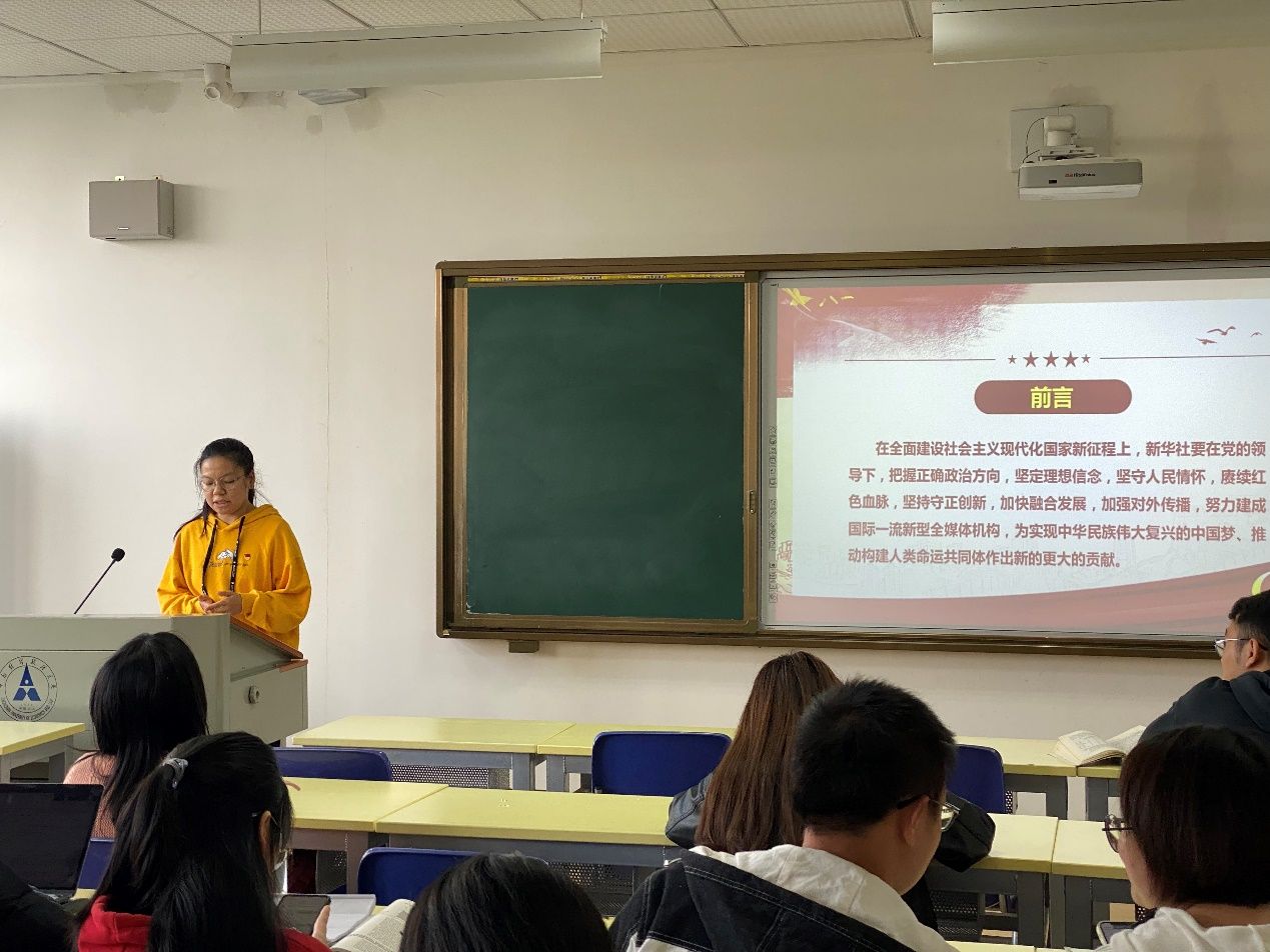 新闻与文化传播学院2020级研究生党支部成员廖阳清以“百年党史,新闻人的传承”为主题展开,分为“新民主主义革命时期”、“社会主义革命和建设时期”、“改革开放和社会主义现代化建设新时期”和“新时代”四个部分,带领大家深入了解新闻传播的发展历程和新闻理论的创新完善,并结合自身专业知识,指出要加快构建中国话语和中国叙事体系,加强对中国共产党的宣传阐释,打造融通中外的新概念、新范畴、新表述,做党和人民信赖的新闻工作者。