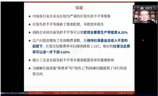 首先,中国人民大学张子尧博士分享了题为《社会保险降费政策空间有多大——企业社保负担不平等与要素配置效率视角》的论文。论文指出企业间社保负担存在不平等的现象,并且可以通过消除其中的扭曲在使社保费率降低的同时不减少社保收入。张子尧博士通过分析得出,消除企业间社保不平等的现象可以使宏观全要素生产率提高。同时,在保证社保基金总收入大体不变的情况下,允许社保实际费率和法定税率调低。米兰电竞·(中国区)财政税务学院刘庆助理教授对该论文进行了点评。刘庆老师认为,该论文十分具有指导意义,但对于企业行业内部所造成的社保差异现象、社保的不平等究竟是企业自我选择还是外因导致等问题上还可以进一步改进。