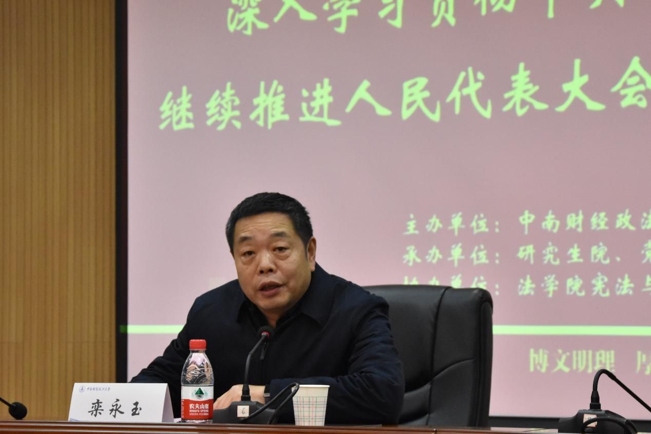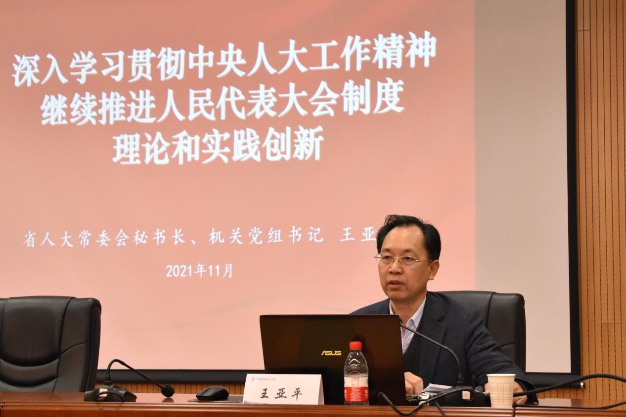 (通讯员 付慧娟 黄丽琼 冯圆圆 摄影 卫瑞 胡心瑜)为深入学习贯彻中央人大工作会议精神,引导广大研究生深入领会人民代表大会制度的内涵,坚定不移走中国特色社会主义民主政治道路,11月29日晚,研究生院、党委研究生工作部联合法学院宪法与行政法学科、人民代表大会制度研究所于文澴楼南附楼101报告厅,举办了第215期“文澜大讲堂”。湖北省人大常委会党组成员,省人大常委会秘书长,机关党组书记王亚平同志受邀作为主讲嘉宾,以“深入学习贯彻中央人大工作会议精神,继续推进人民代表大会制度理论和实践创新”为主题,为广大研究生全面解读中央人大工作会议精神,深入阐释人民代表大会制度内涵和未来发展。校党委书记栾永玉教授、研究生院院长胡弘弘教授、党委研究生工作部肖翠祥部长、法学院院长陈柏峰教授,法学院宪法与行政法学科刘茂林教授、王广辉教授、陈新副教授,党委研究生工作部白玉副部长出席报告会。报告会由栾永玉书记主持。