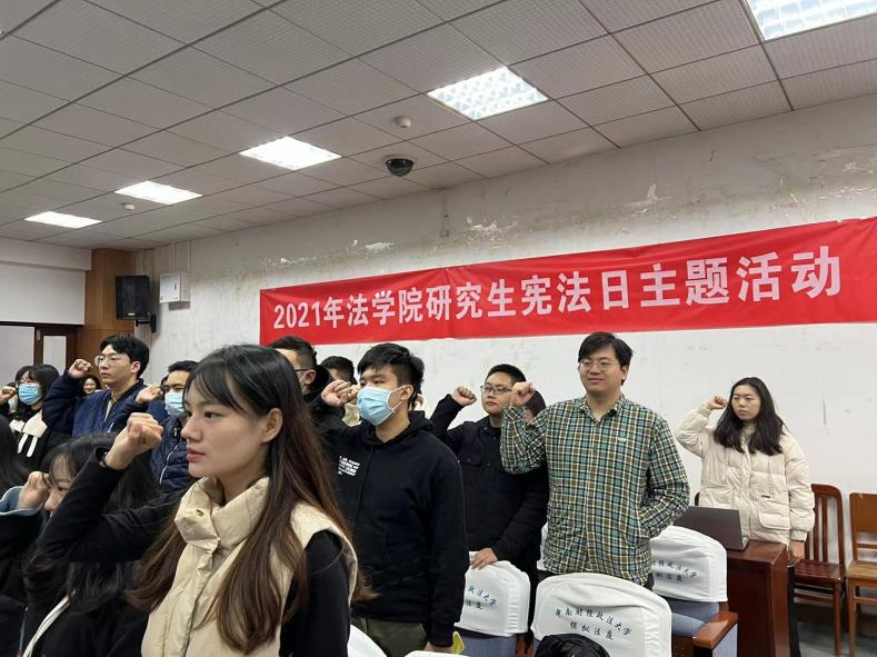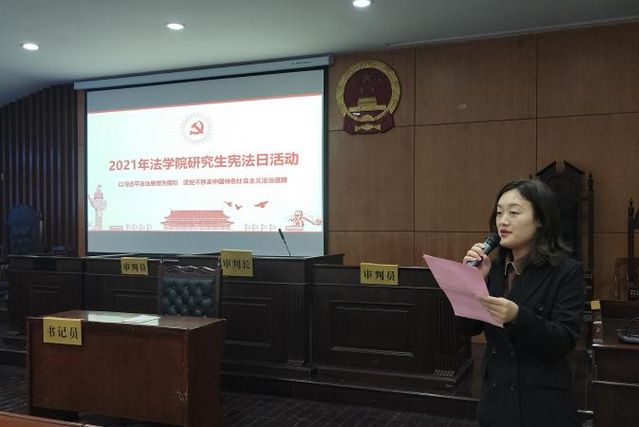 (通讯员:刘洁 徐莞玲)为了庆祝中国共产党建党100周年,迎接第八个国家宪法日,号召法学院研究生集中深入学习宣传宪法,弘扬宪法精神,维护宪法权威。 10月4日上午10时,法学院于文泰楼模拟法庭二举办“宪法日活动”,各班级同学皆响应号召前往模拟法庭参加活动。此次活动由法学院研究生会举办,此次活动以“以习近平法治思想为指引 坚定不移走中国特色社会主义法治道路”为主题,采用播放宪法主题纪录片和带领同学宣誓的多样形式展开,获得同学们的广泛认同,活动参与者收获良多。