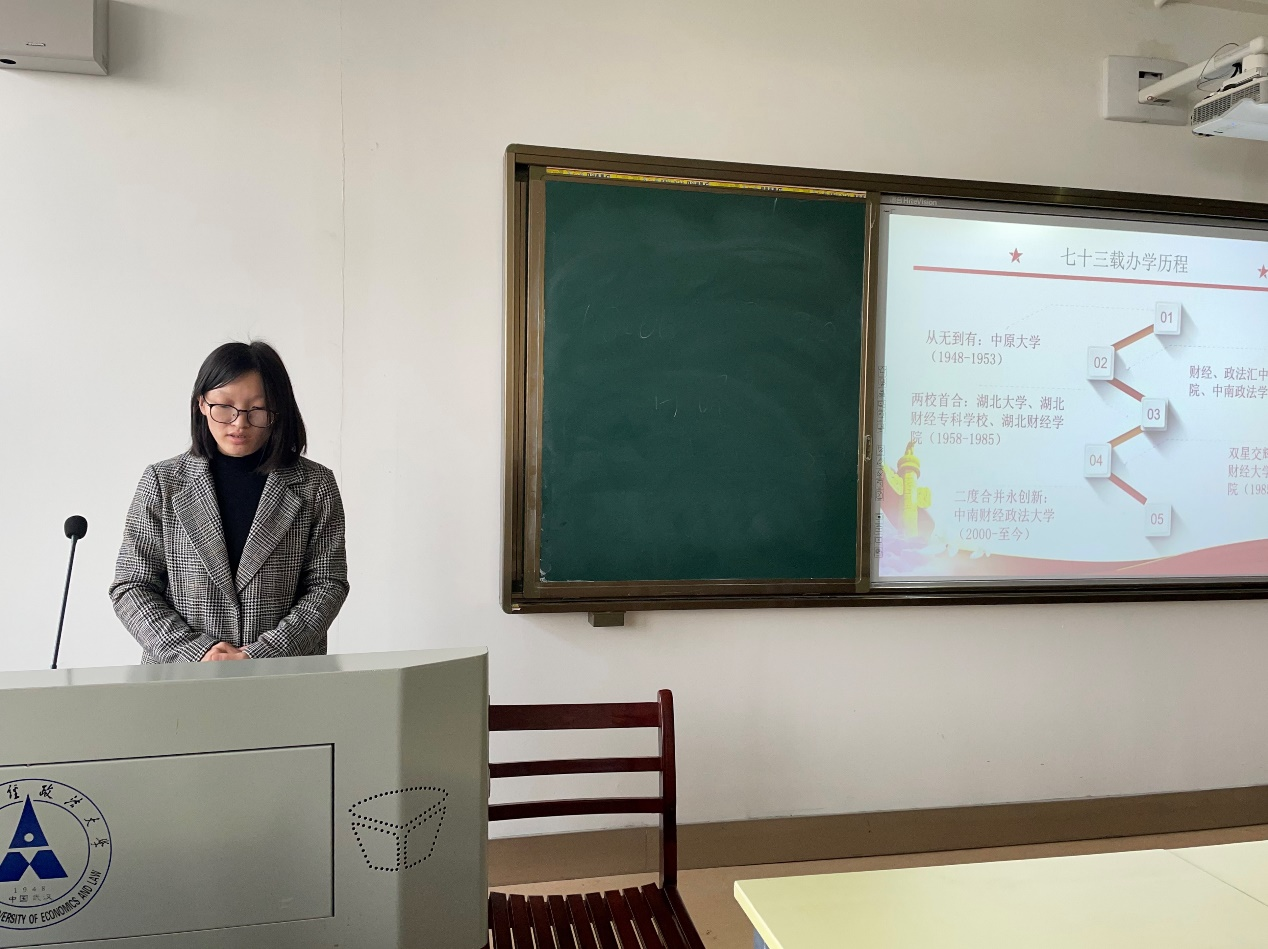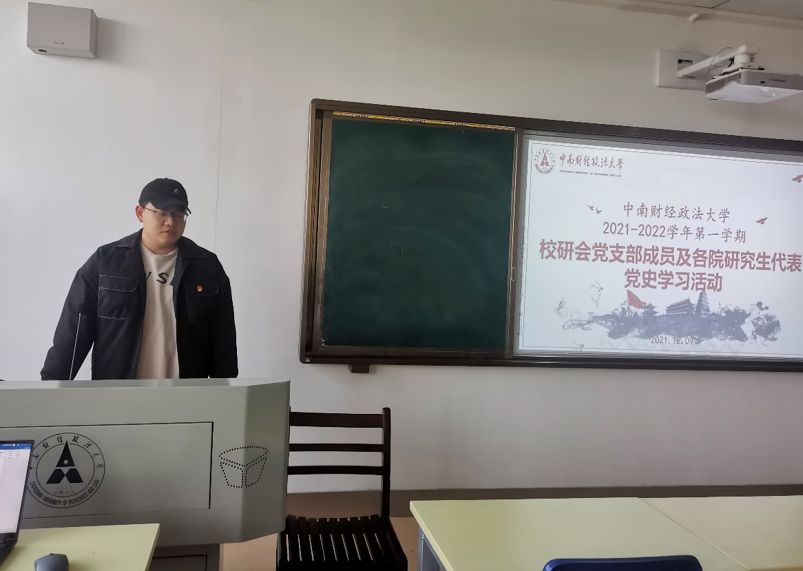 (通讯员 付慧娟 黄丽琼 卫瑞 万宇)为深入学习党的十九届六中全会重要精神,深刻领会习近平总书记在庆祝中国共产党成立100周年大会上的重要讲话精神,推进党史学习教育走深走实,充分发挥党史以史鉴今、资政育人的重要作用,我校于2021年12月9日下午在文澴楼517教室开展了研究生党支部党史学习教育宣讲接力第八讲。本次宣讲由信息与安全工程学院研究生党支部和文澜学院学生党支部成员主讲,经济学院2020级研究生党支部成员罗厾尧主持,校研究生会党支部成员、各学院(中心)研究生代表参加。