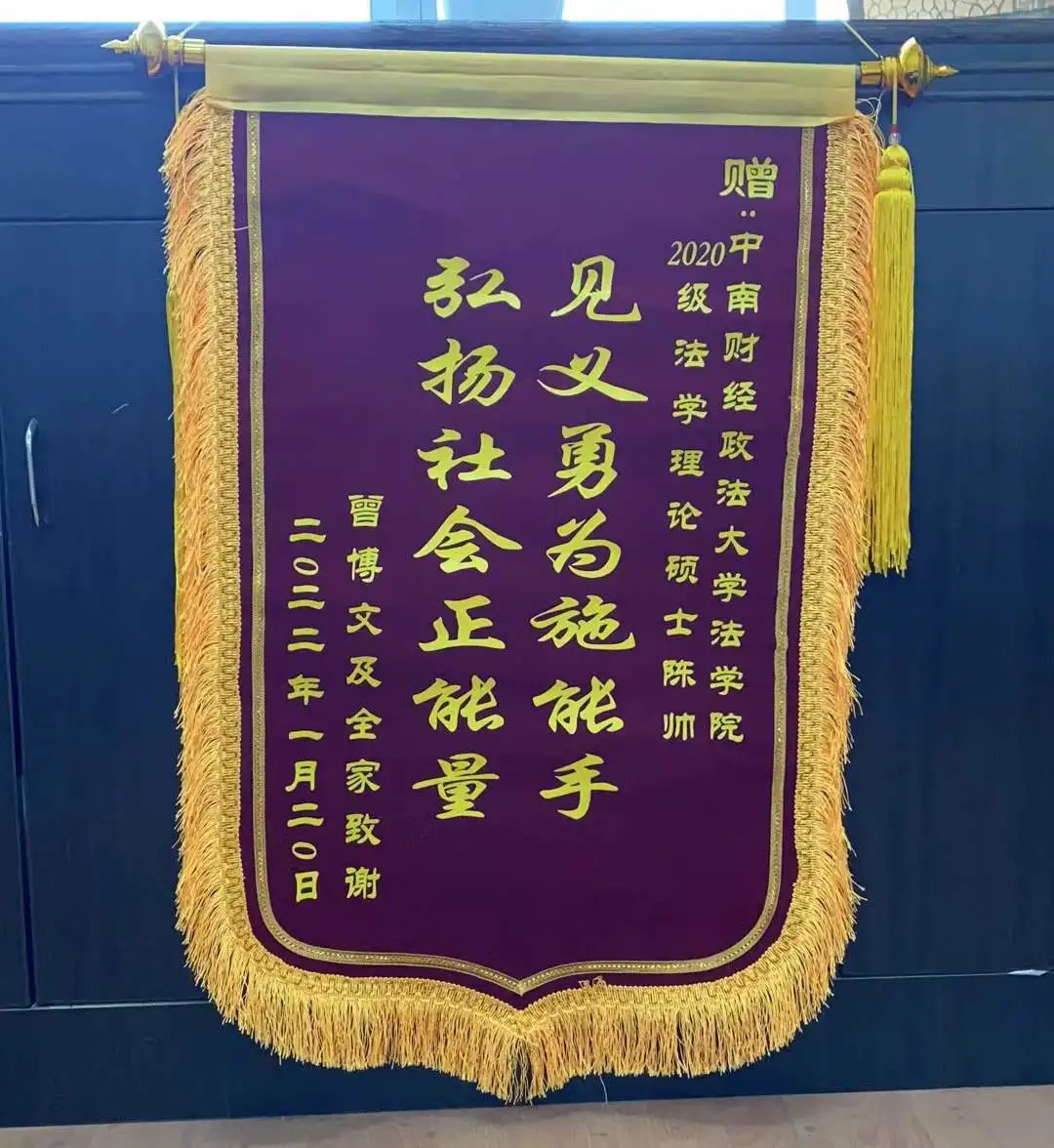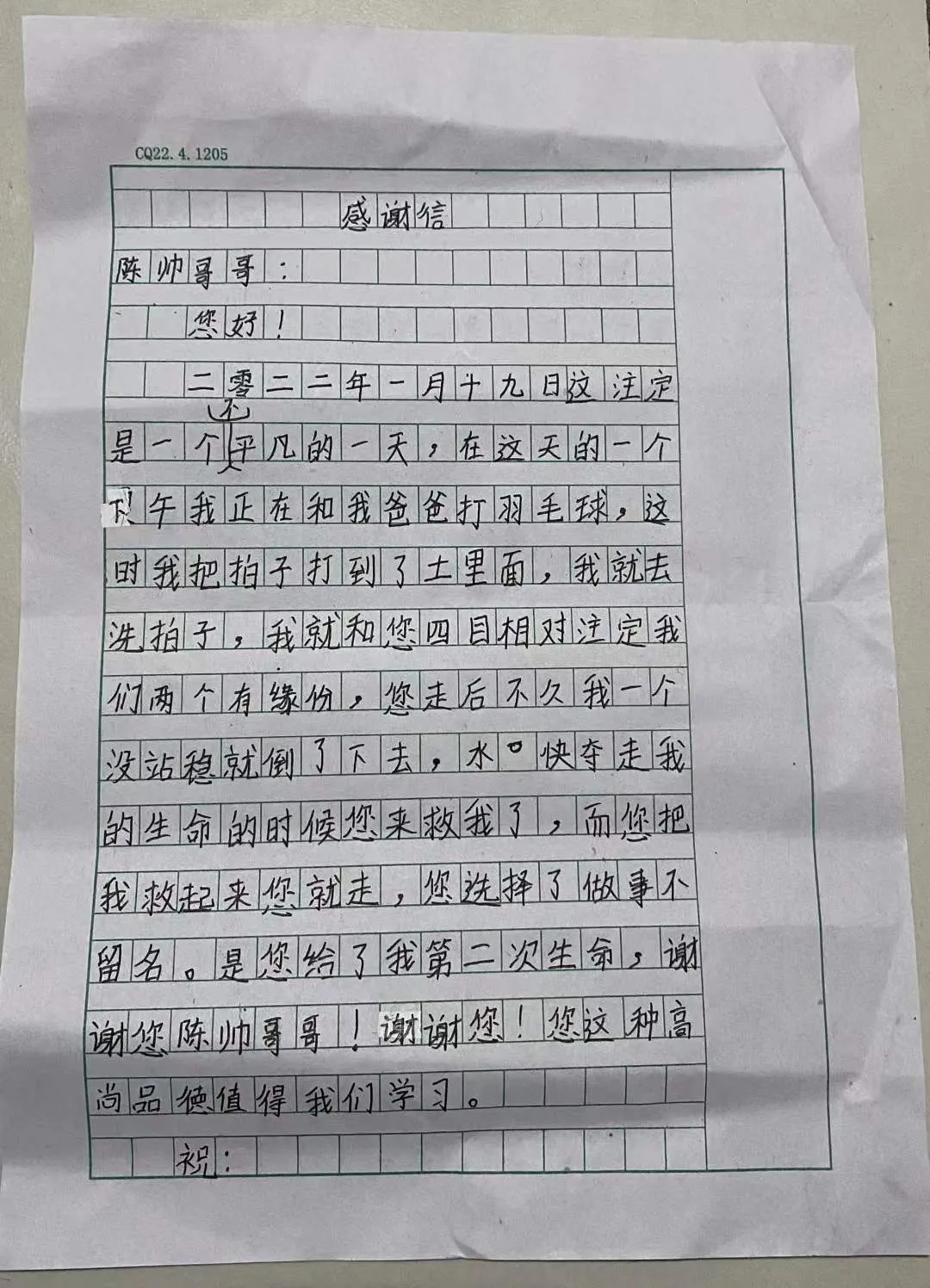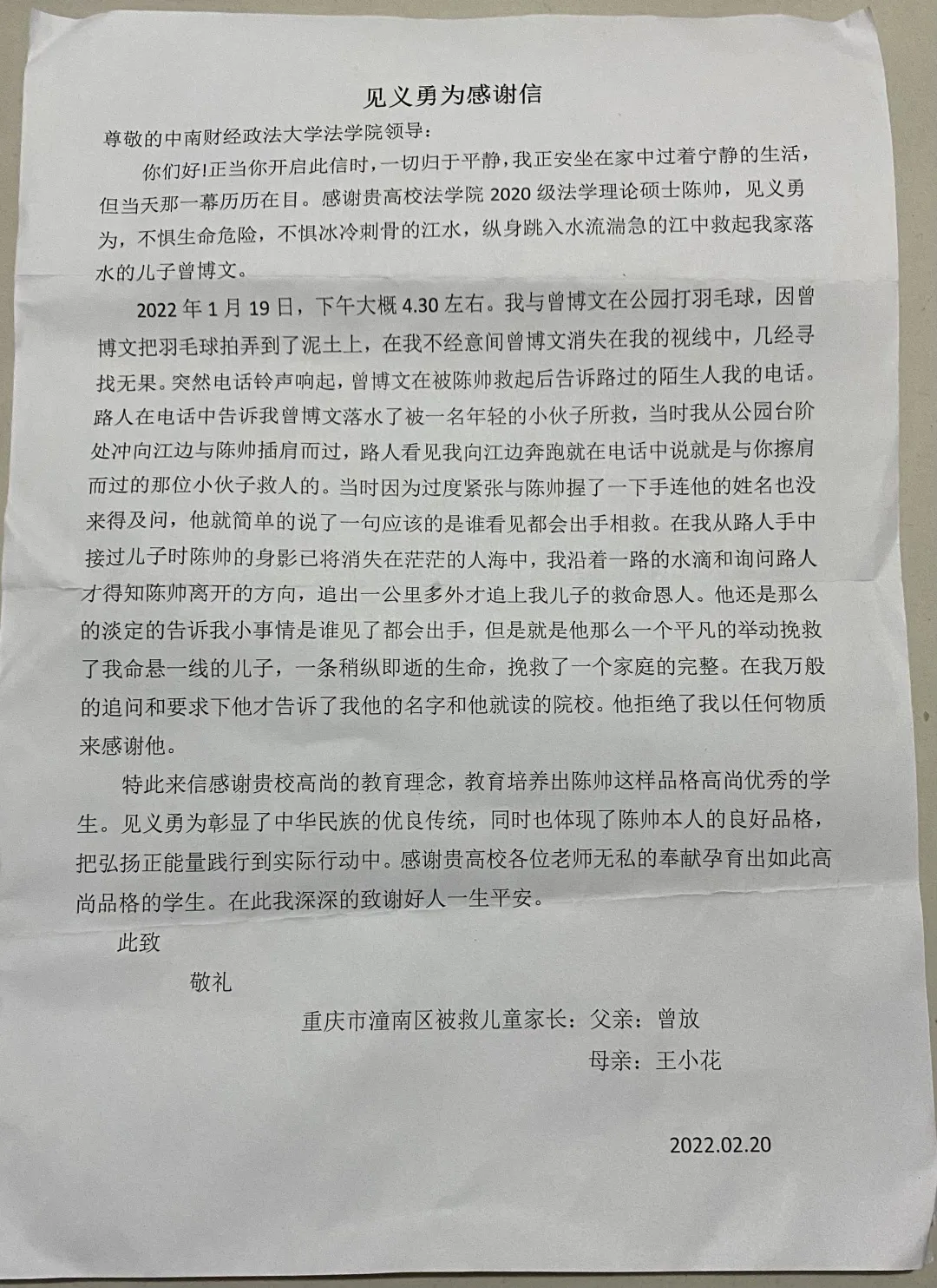 近日,我校收到了一封来自一个重庆三口之家的感谢信,“感谢贵校法学院2020级法学理论硕士陈帅,见义勇为,不惧生命危险,不惧冰冷刺骨的江水,纵身跳入湍急的江水中救起我家落水的儿子,挽救了我们整个家庭。”