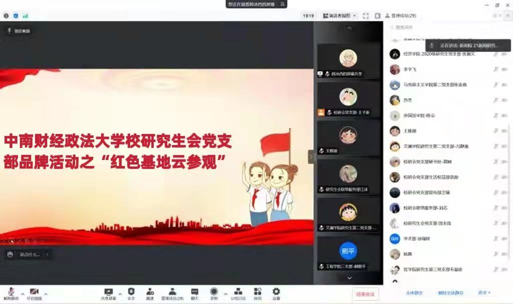 本次“红色基地云参观”活动共包括寻访初心,见证初心,牢记初心和永葆初心四个环节以及两个阶段。第一阶段,各位党员同志在家以线上形式“云参观”了中共一大会址、南湖革命纪念馆、西柏坡纪念馆、塞罕坝展览馆与焦裕禄同志纪念馆,第二阶段,研究生会党支部召集各位党员同志于腾讯会议展开谈论并集中观看了《见证初心和使命的“十一书”》与《摆脱贫困》两部纪录片。