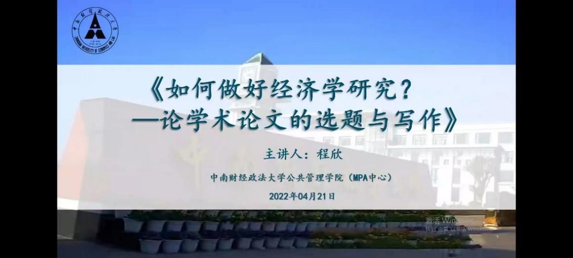 (通讯员 魏晨雪 韩泽慧)2022年4月21日晚18:30,由我校研究生院、党委研究生工作部和校研究生会主办,公共管理学院研究生会承办的“文澜大讲堂”之新锐论坛通过腾讯会议线上形式成功举行。此次讲座以“《如何做好经济学研究?——论学术论文的选题与写作》”为主题,特邀公共管理学院程欣老师主讲,公共管理学院2021级全体硕士研究生参会学习。讲座由公共管理学院研究生会学术部干事余晓倩同学主持。