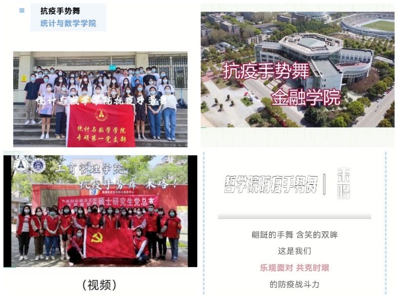 “抗疫手势舞”由各学院研究生党支部拍摄,研究生会公众号进行宣传展示,共有法学院、哲学院、会计学院、数学与统计学院、金融学院、工商管理学院、财政税务学院、信息与安全工程学院8个学院参与其中,各学院之间积极分工,相互配合,最终顺利完成此次接力活动。各学院分别通过宣传防疫志愿故事、分享防疫小贴士、抒发抗疫感悟等形式号召师生们坚守防疫阵线、珍惜抗疫成果,在疫情中沉心静气,守住自觉和担当。从各学院抗疫宣传活动中,我们可以感受到中南大青年党员们用一个个手势展现的真挚祝福和传递的一份份真心。