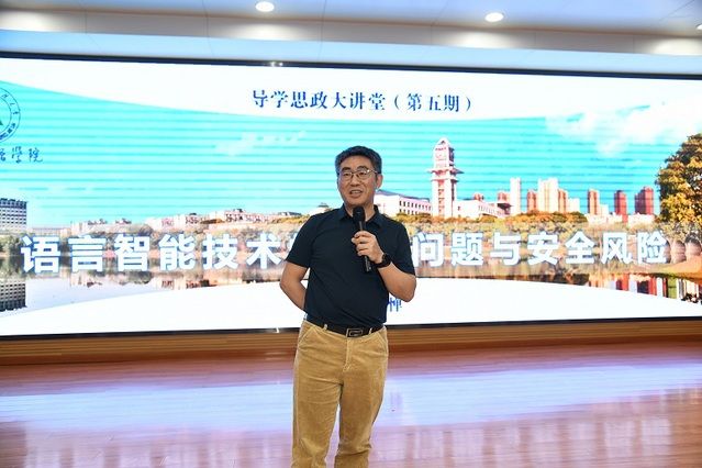 接下来,学院副院长胡惮教授为大家带来了主题为“语言智能技术的伦理问题与安全风险”的导学思政大讲堂。讲座由王芹副书记主持,阮全友副院长进行点评。