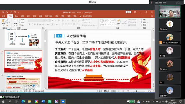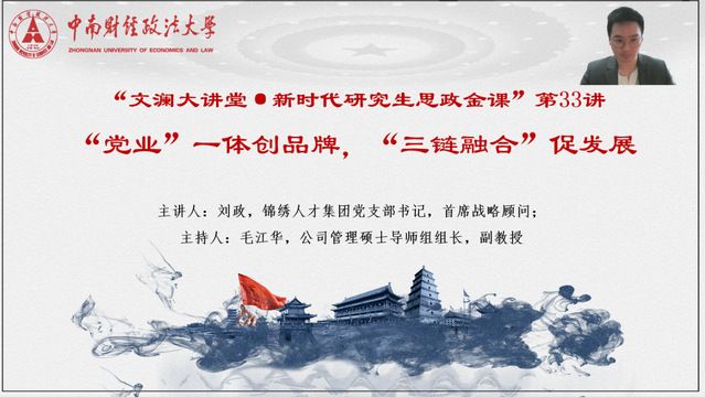 (通讯员:兰诗瑶)为深入贯彻人才强国战略,了解“党业”融合发展机制,工商管理学院于2022年10月31日下午在腾讯会议成功举办了第33期“文澜大讲堂·新时代研究生思政金课”——“党业”一体创品牌,“双链融合”促发展”。本期思政金课邀请锦绣人才集团党支部书记,首席战略顾问刘政老师担任主讲嘉宾,由企业管理(公司管理)硕士导师组组长毛江华副教授主持。工商管理学院副院长胡川教授、刘文通老师以及各专业研究生等参加了本次讲座。