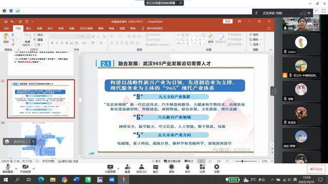 在“融合发展”部分,刘政老师从多个维度说明我国产业发展对人才的迫切需求,重点阐述了“武汉‘965产业’发展人才”的工作重心,点明武汉充分把握和利用高校人才以推动武汉“965产业”建设的关键性,并在此背景下,向同学们详细介绍了“双链”融合和“党业”融合的重要内容。刘政老师指出,人才是产生科技优势和创新优势的不竭动力,而以产业链为依托进行人才发展则能够创造更大的价值,因此施行产业链与人才链的“双链”融合发展十分必要。与此同时,“党管人才”是实现人才优势的重要路径,党建与人才融合发展,能够推动人才机制改革,在政治引领下才能使人才迸发出更多的创新成果,形成“党业”融合。