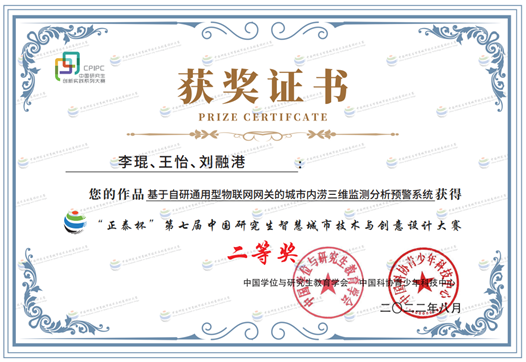 (通讯员 杜建华、陈子鹏)2022年8月14日,第七届中国研究生智慧城市技术与创意设计大赛圆满结束,信息与安全工程学院研究生李琨、王怡、刘融港三位同学的参赛作品《基于自研通用型物联网网关的城市内涝三维监测分析预警系统》喜获全国决赛二等奖。