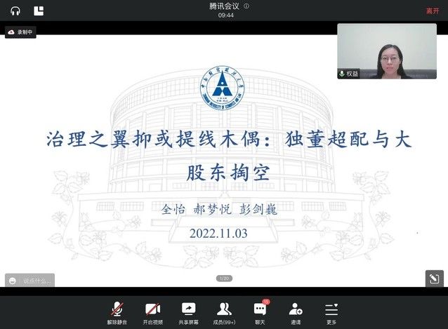 (通讯员 杭慧喆 卫家雯 张荣)11月3日下午15:00,由研究生院、党委研究生工作部和校研究生会主办,会计学院研究生会承办的“文澜大讲堂”之新锐论坛活动在腾讯会议线上举行。本次讲座由会计学院全怡副教授主讲,讲座主题为“治理之翼抑或提线木偶:独董超配与大股东掏空”。因疫情防控需要,活动采取线上会议的方式开展,总共近400名同学参加了此次讲座。