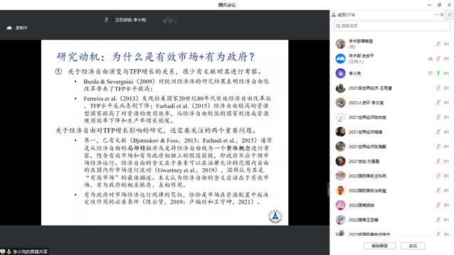 讲座开始,李老师将其与徐志鹏老师共同撰写的《经济自由与全要素生产率——基于“有效市场、有为政府”和偏向性技术进步的双重视角》一文向同学们进行了介绍。从研究背景到研究动机,李老师向同学们阐释了经济自由、新自由主义、有效市场及有效政府等新观点。李老师进一步指出“逆全球化”背景下TFP的增长率在世界各国普遍下降的事实,而现有文献中很少对经济自由演变和全要素生产率增长关系进行考察,并且已有文献在考证中也是隐含中性技术进步假设,而事实上,偏向性技术进步才是技术进步的一般形态。为深入理解经济自由变迁与全球TFP演变的关系,李老师基于“有效市场+有为政府”和偏向技术进步的双重视角,系统考察了经济自由演变对TFP增长的影响和机制。