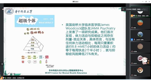 (通讯员:范瑶)为帮助新生尽快适应研究生生活,缓解学术科研等压力情境引起的情绪焦虑,通过积极的心理调适更好的应对“内卷”,2022年11月30日下午14:30,工商管理学院成功举办了“内卷高压下的应对方法与心理调适”心理健康专题讲座。本次讲座特邀请中国心理学会注册心理师、华中科技大学心理健康教育中心副主任郭晓丽老师结合当下最受学生关注的心理话题之一“内卷”进行分享,学院全体2022级硕士研究生参加。