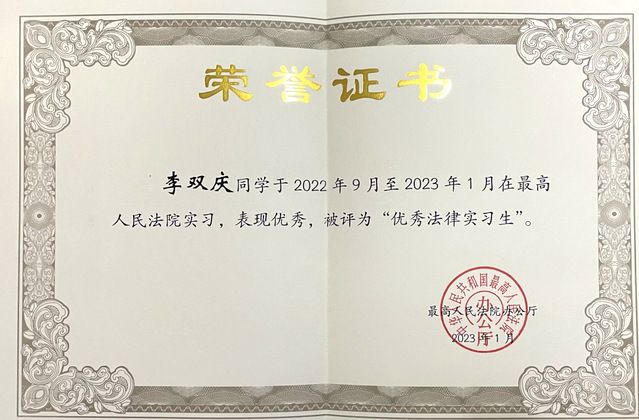 2023年1月,最高人民法院第十一批法律实习生项目圆满结束,经各实习单位评审、推荐,我校法学院诉讼法专业2021级硕士研究生李双庆荣获由最高人民法院办公厅、政治部、机关党委组织评选的“优秀法律实习生”荣誉称号。据悉本批来自全国法律院校实习生共遴选出70,实习期为2022年9月至2023年1月,为期四个月。