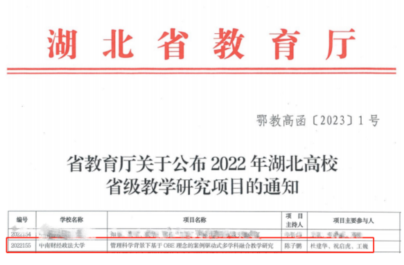 (通讯员:刘桐)近日,湖北省教育厅发布《省教育厅关于公布2022年湖北高校省级教学研究项目的通知》(鄂教高函〔2023〕1号),我校获批1项2022年省级研究生教学研究项目。