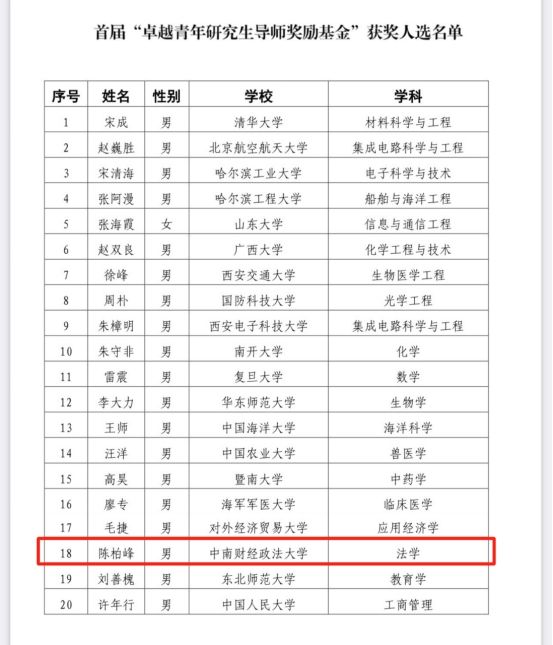 陈柏峰教授入选我国首届“卓越青年研究生导师奖励基金”获奖名单