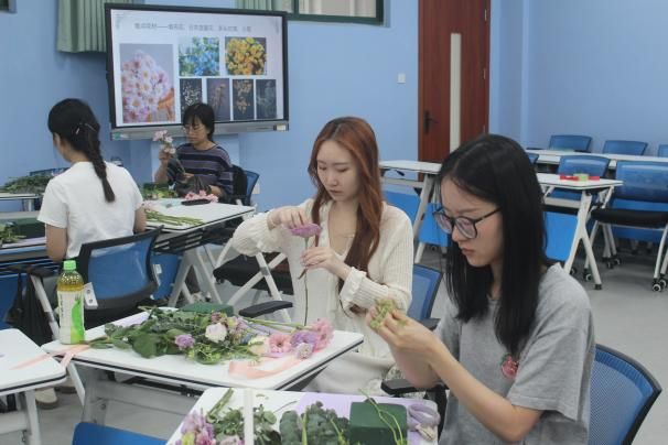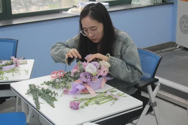 在花材剪切技巧的细致讲解后,师生们开始了自己的插花创作。活动现场气氛热烈,参与者们或专注挑选花朵,或热烈讨论技巧,或认真修剪枝叶,每个人都在用自己的方式诠释对插花艺术的理解和热爱。